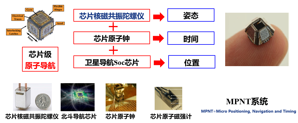 基于无线电测距原理的卫星导航在室外空旷场景能够实现高精度定位,但在隧道、室内等场合将无法使用,同时由于卫星导航基于“单点定位原理”,也无法给出方向、姿态等信息,从而限制了其在无人系统、工业物联网控制、行人级高精度导航等场景应用。解决这些问题的关键是采用惯性导航系统,其核心部件之一是兼具高精度和芯片化优势的核磁共振陀螺仪。以核磁共振陀螺仪为核心,加入卫星导航技术、芯片原子钟技术,形成芯片级的定位导航微系统(MPNT)终端,是未来导航系统向着高精度、芯片化、智能自适应融合发展的关键。